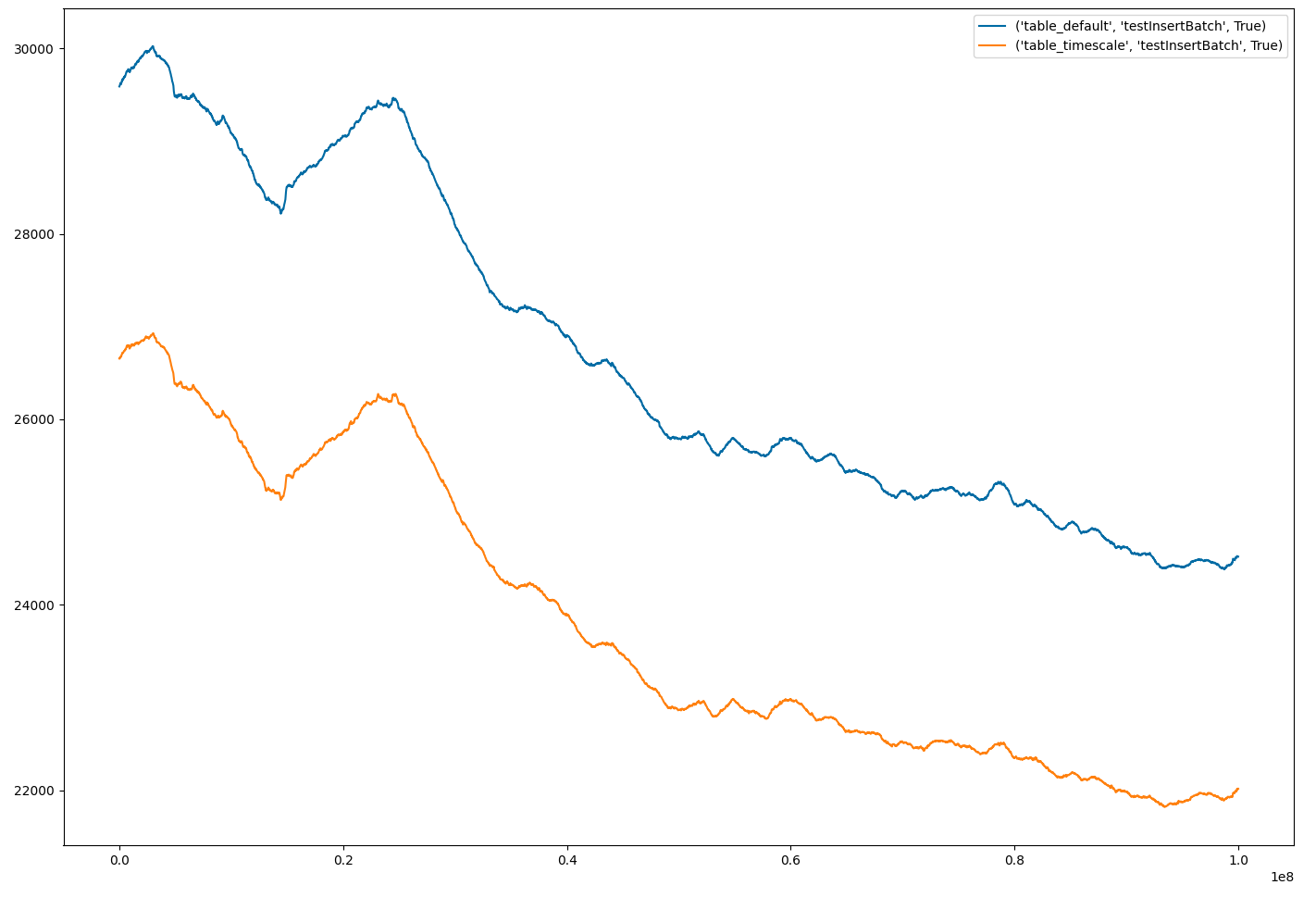 Wouldn’t it be expected that a single insert on TimescaleDB is slower than on vanilla PostgreSQL, because extra work has to be performed? If yes, then indeed, a series of inserts performed serially would see that result as well. The graphs look like that, too.