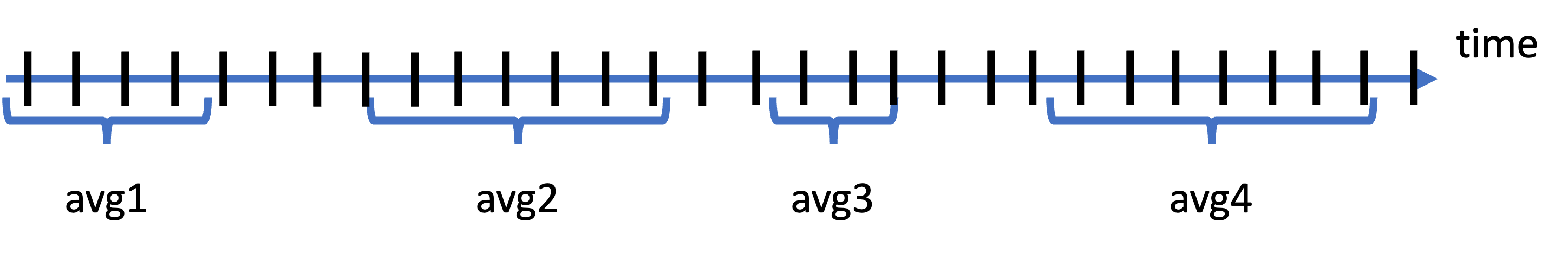 The idea of continuous aggregates seems really interesting for our use case, but unfortunately having regularly spaced time intervals is too restrictive. Consider the following illustration: