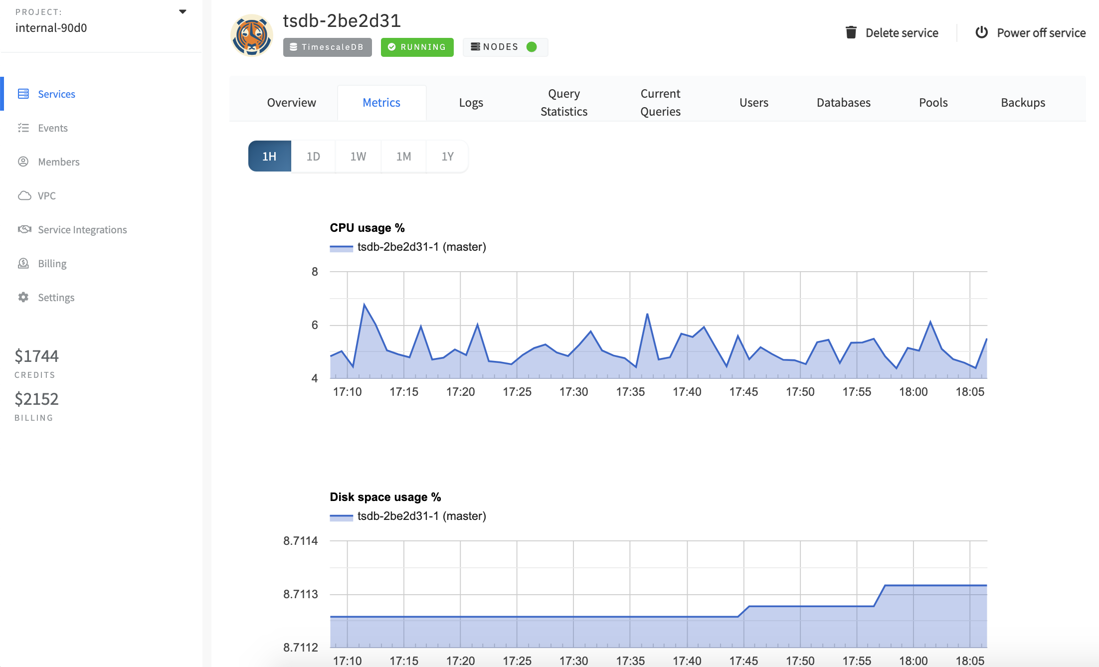 The Managed Service for TimescaleDB portal provides a “Metrics” tab where you can visualize some key metrics for any of your services. There, you can view the following metrics over preset time intervals, e.g. 1 hour, 1 day, 1 week, etc: